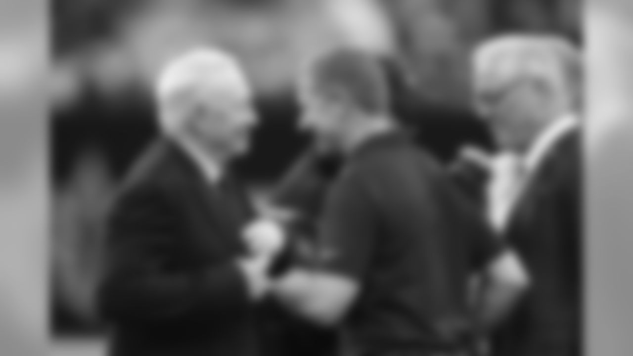 Dallas Cowboys owner Jerry Jones, left, and head coach Jason Garrett talk on the field before an NFL football game against the New Orleans Saints in New Orleans, Sunday, Sept. 29, 2019. (AP Photo/Butch Dill)