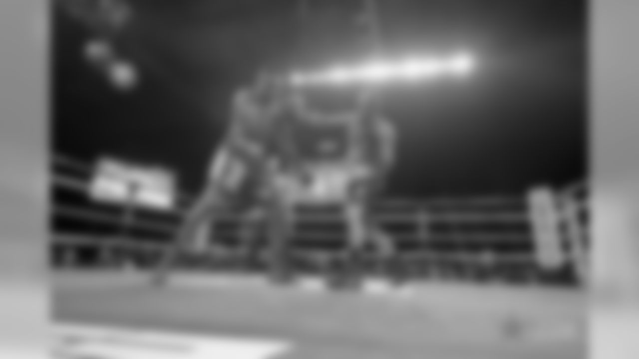 02 February 2019: Welterweight boxing match between Erniko Gogokhiia (white trunks) and Vitor Freitas (black trunks) at Ford Center at The Star in Frisco, Texas. Gogokhiia beat Freitas by knockout in round 3. Photo by James D. Smith/Dallas Cowboys