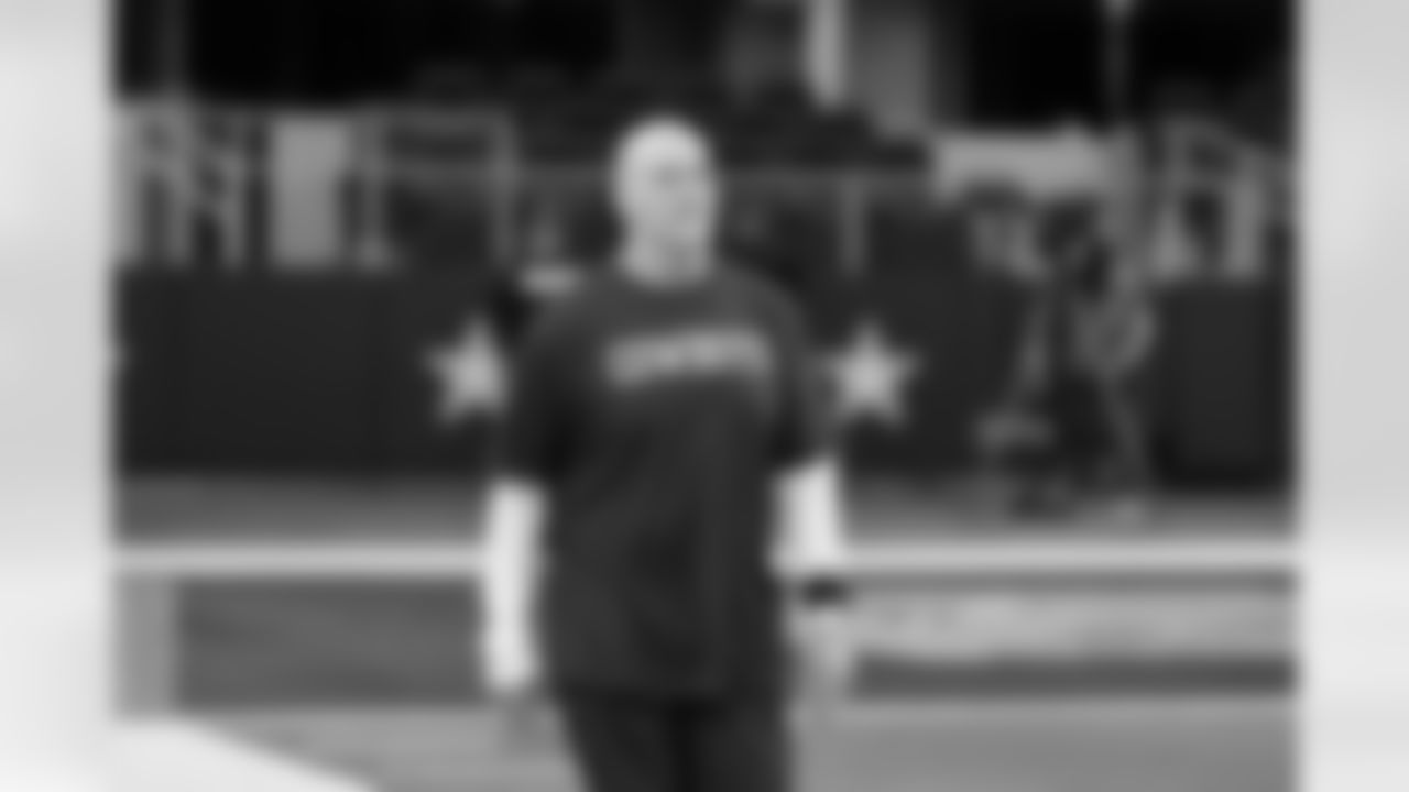 Dallas Cowboys defensive line coach Aden Durde, center, works with players during warmups before an NFL football game against the Atlanta Falcons in Arlington, Texas, Sunday, Nov. 14, 2021. (AP Photo/Ron Jenkins)