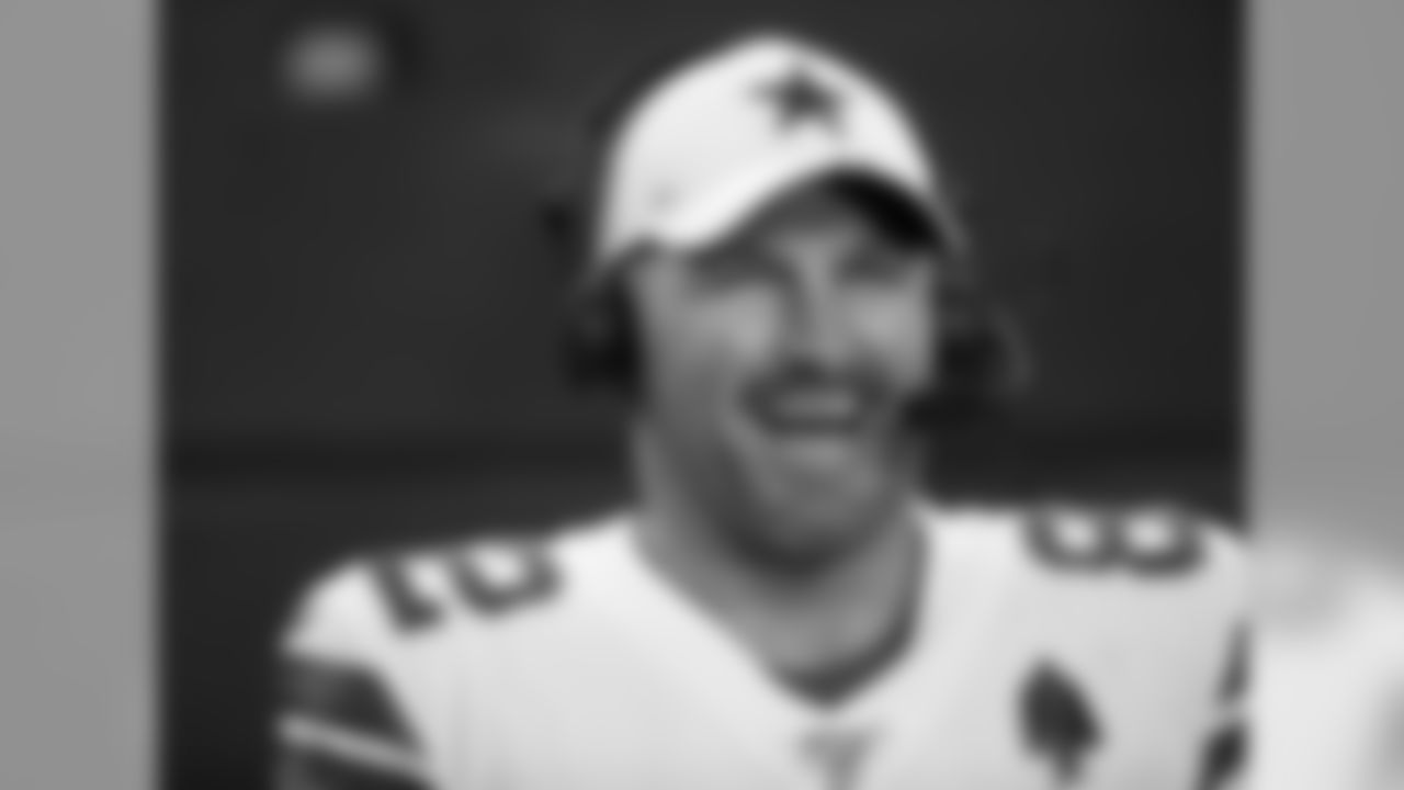 Dallas Cowboys quarterback Dak Prescott (4) talks with teammates on the sideline in the second half of a preseason NFL football game against the Tampa Bay Buccaneers in Arlington, Texas, Thursday, Aug. 29, 2019. (AP Photo/Ron Jenkins)