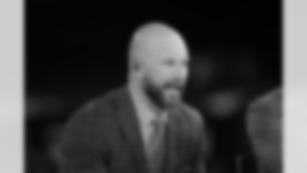 NFLN TNF broadcaster Joe Thomas works the show before the first half of an NFL football game between the New Orleans Saints and the Dallas Cowboys, Thursday, Dec. 2, 2021, in New Orleans. (AP Photo/Derick Hingle)
