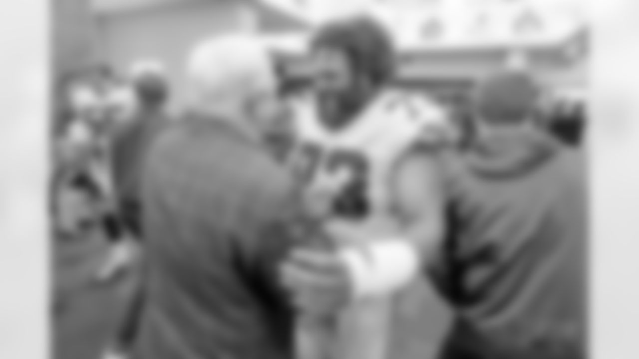 Tampa Bay Buccaneers head coach Dirk Koetter, left, and Dallas Cowboys head coach Jason Garrett, right, greet each other after their NFL football game in Arlington, Texas, Sunday, Dec. 23, 2018. (AP Photo/Michael Ainsworth)