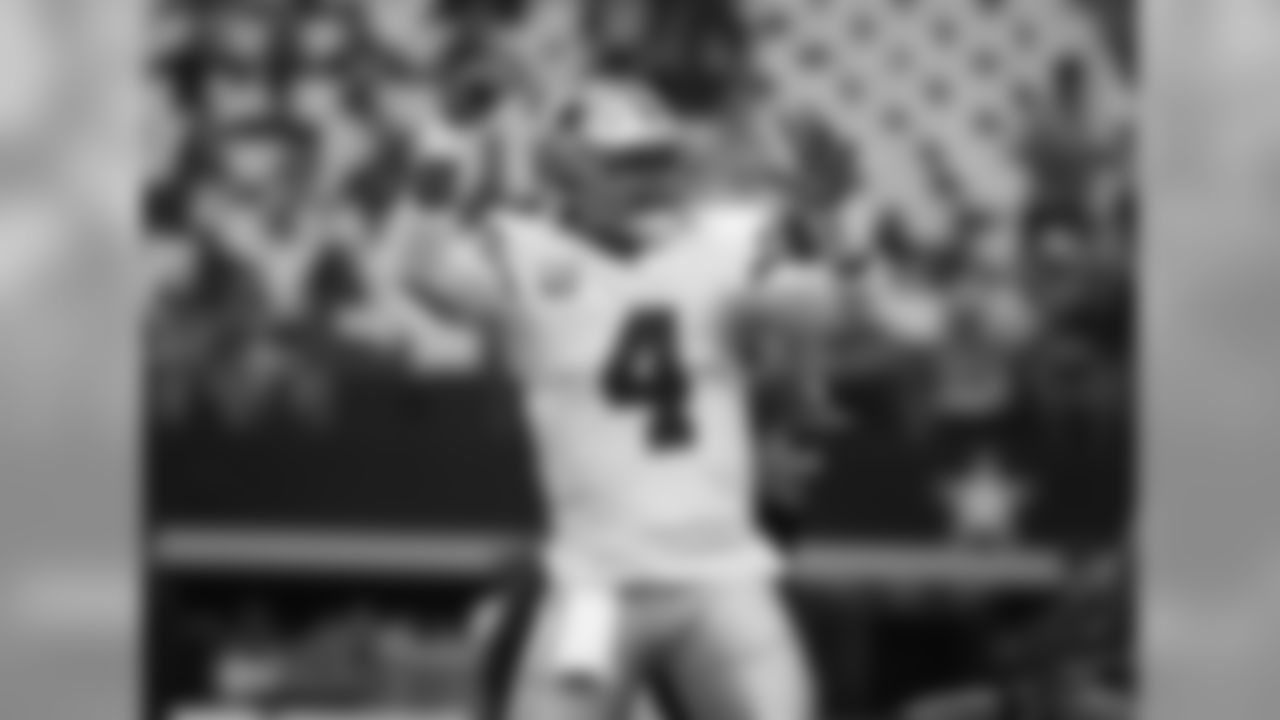 Dallas Cowboys quarterback Dak Prescott (4) warms up before an NFL football game against the Green Bay Packers in Arlington, Texas, Sunday, Oct. 6, 2019. (AP Photo/Ron Jenkins)