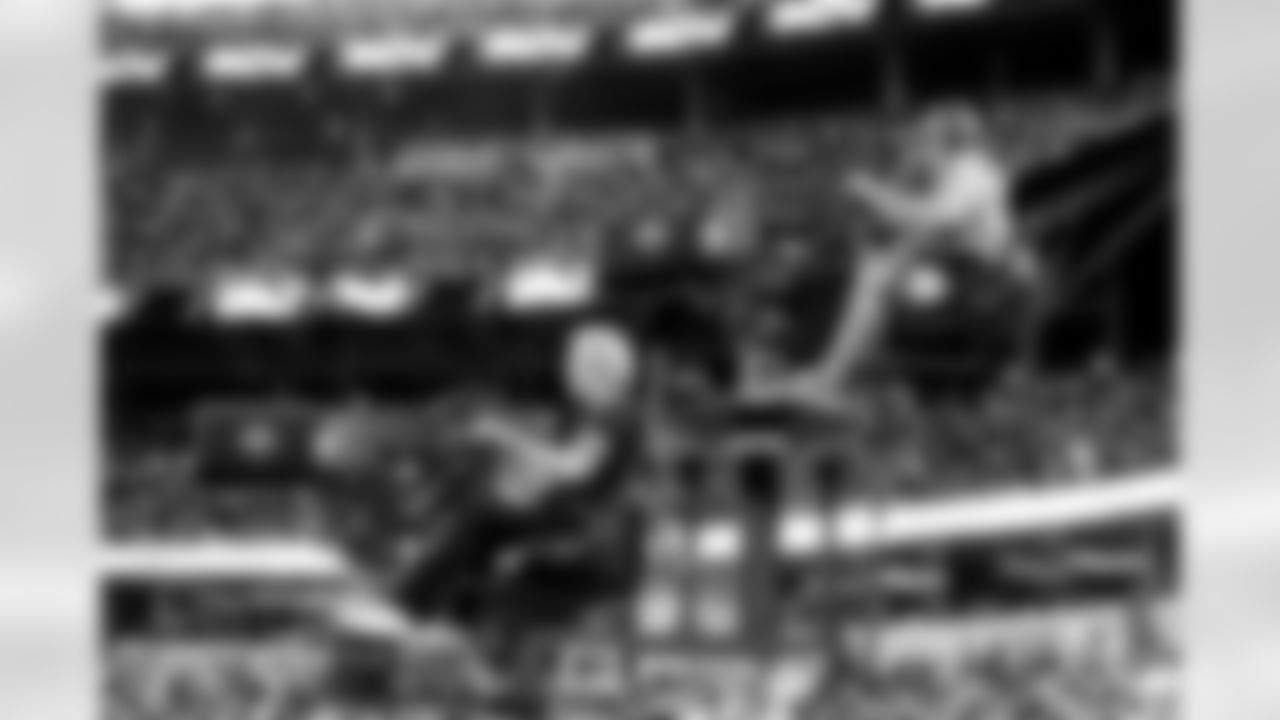Dallas Cowboys wide receiver CeeDee Lamb (88) leaps over Los Angeles Chargers safety Dean Marlowe (20) after a catch during the first half of an NFL football game Monday, Oct. 16, 2023, in Inglewood, Calif. (AP Photo/Ashley Landis)