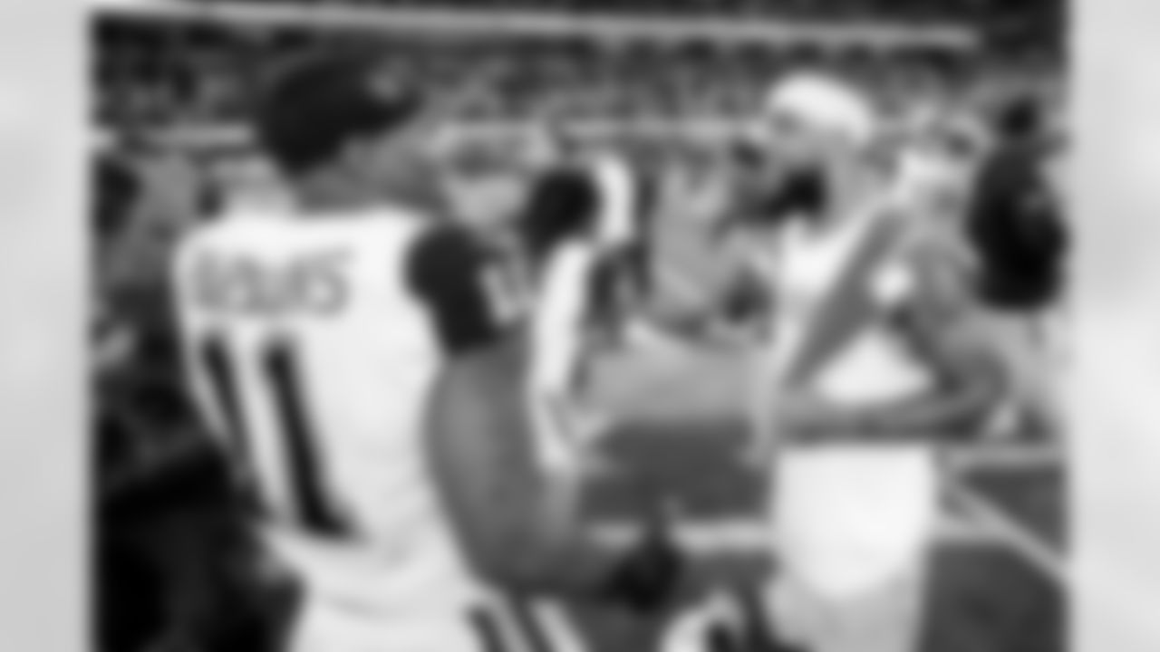 Dallas Cowboys linebacker Micah Parsons (11) talks to Los Angeles Chargers wide receiver Keenan Allen (13) after an NFL football game Monday, Oct. 16, 2023, in Inglewood, Calif. (AP Photo/Mark J. Terrill)