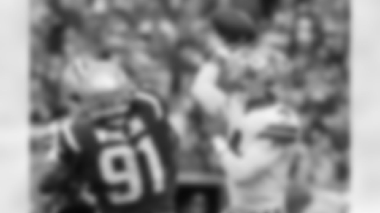 Dallas Cowboys quarterback Dak Prescott (4) throws a pass while pressured by New England Patriots defensive end Deatrich Wise (91) during the first half of an NFL football game, Sunday, Oct. 17, 2021, in Foxborough, Mass. (AP Photo/Steven Senne)