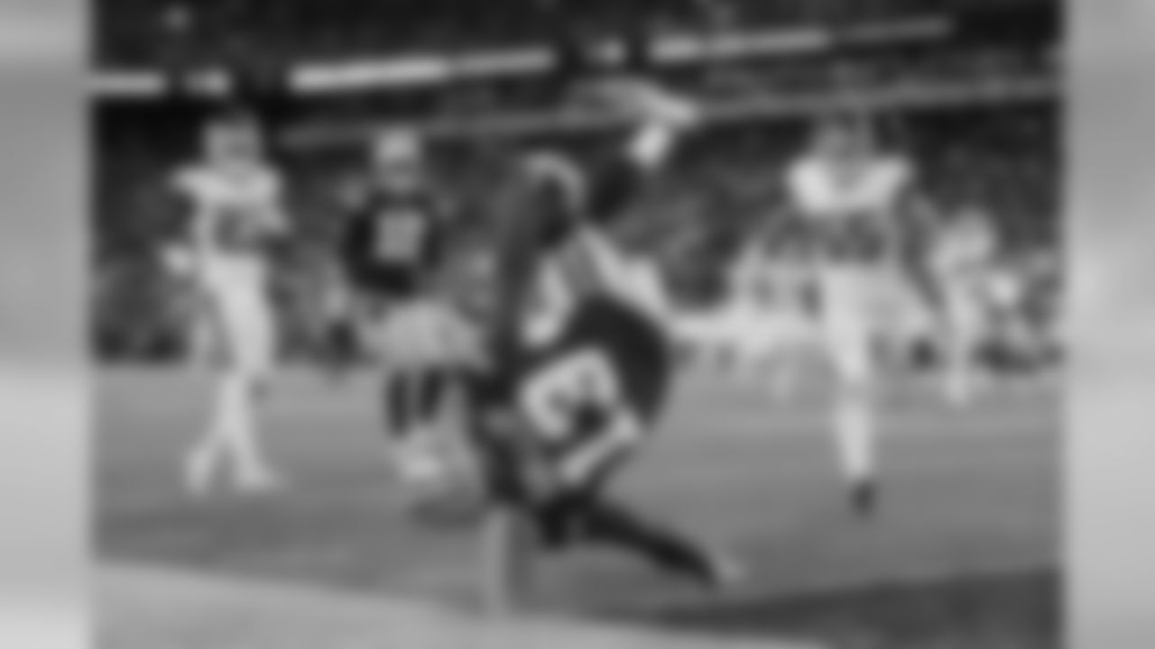 Dallas Cowboys wide receiver Michael Gallup (13) stays in bounds as he flips over the goal line to score a touchdown against the New York Giants during the fourth quarter of an NFL football game, Monday, Nov. 4, 2019, in East Rutherford, N.J. (AP Photo/Adam Hunger)